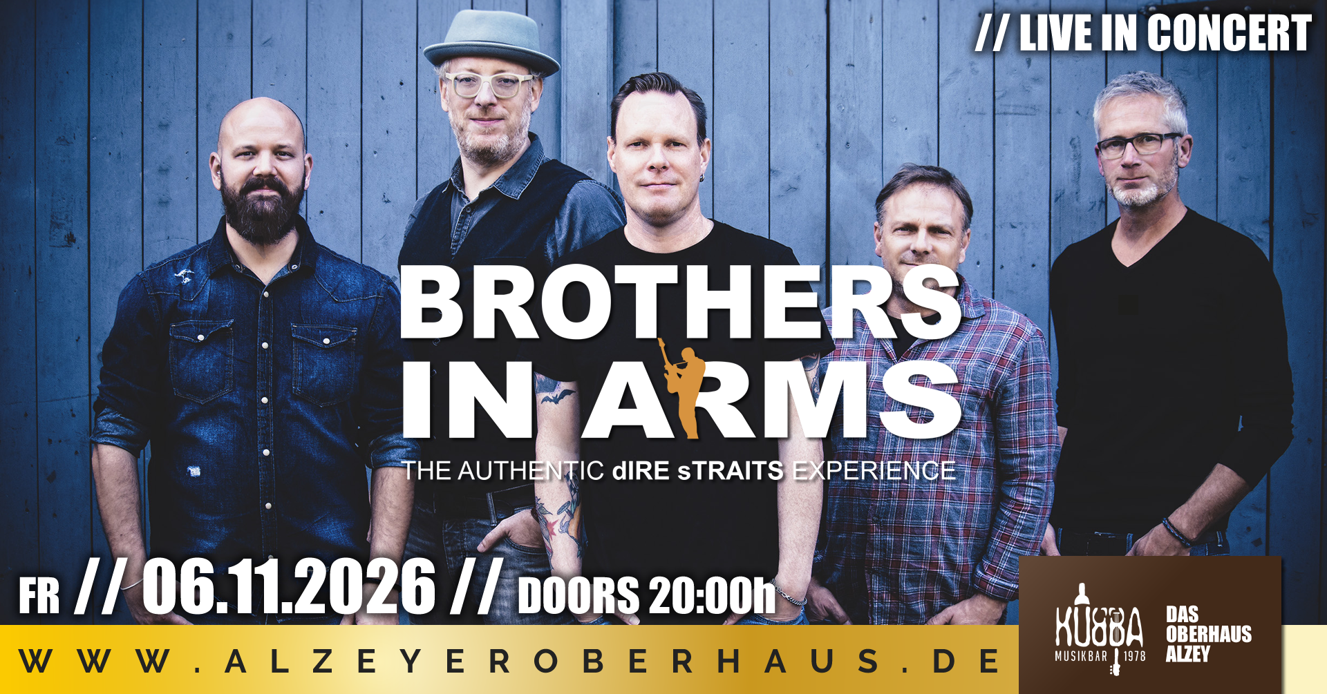 Brothers in Arms, nicht nur diesen Song kennen Dire Straits Fans, sondern auch die vielen anderen Welthits der großartigen Band um Mark Knopfler. Konzertfreunde bedauern jedoch, dass gerade diese Band schon lange nicht mehr live zu erleben war. Eine Bühnenabstinenz seit rund 25 Jahren gaben Anlass, den musikalischen Waffenbrüdern eine Art Renaissance zu verpassen. So war es naheliegend, dass sich für die im Jahr 2002 gegründete Formation “Brothers in Arms“ eine handvoll auserwählter Musiker fand, die er nicht nur verstehen die Hits, sondern auch den Geist und die Atmosphäre von Dire Straits live zu reproduzieren. Und das mit einer von Jahr zu Jahr wachsenden Fangemeinde und weit über die Grenzen Deutschlands hinaus.