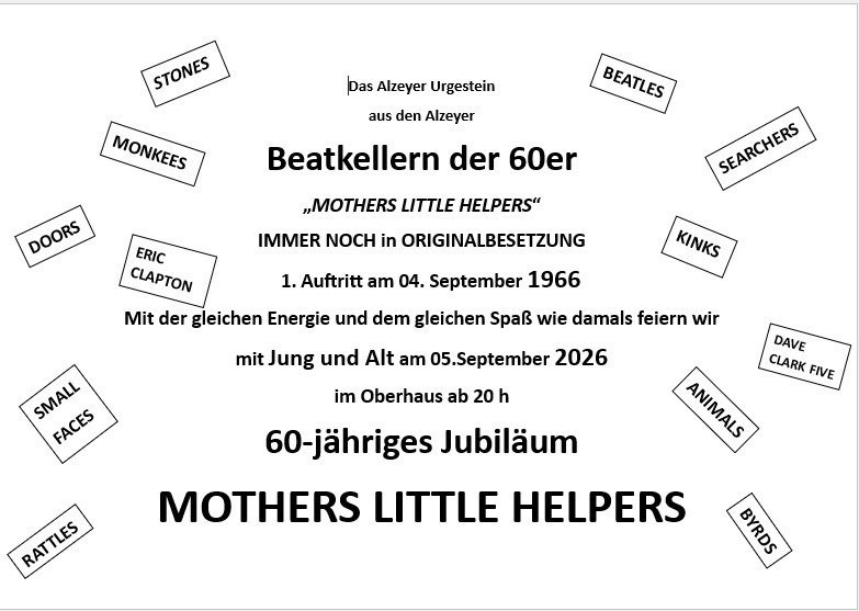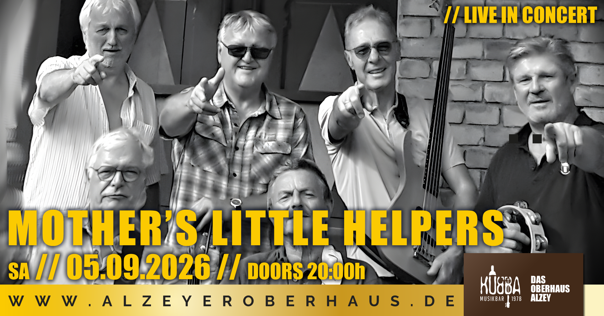 Günther Bolz, Wolfgang Görtz, Elo Orth, Kurt Feth und Erich Brück laden alle Fans und natürliche jeden Interessierten herzlich ein, den Abend bei „handmade music“ mit „MOTHERS LITTLE HELPERS“ im Oberhaus in Alzey ab 20.00 h zu verbringen.