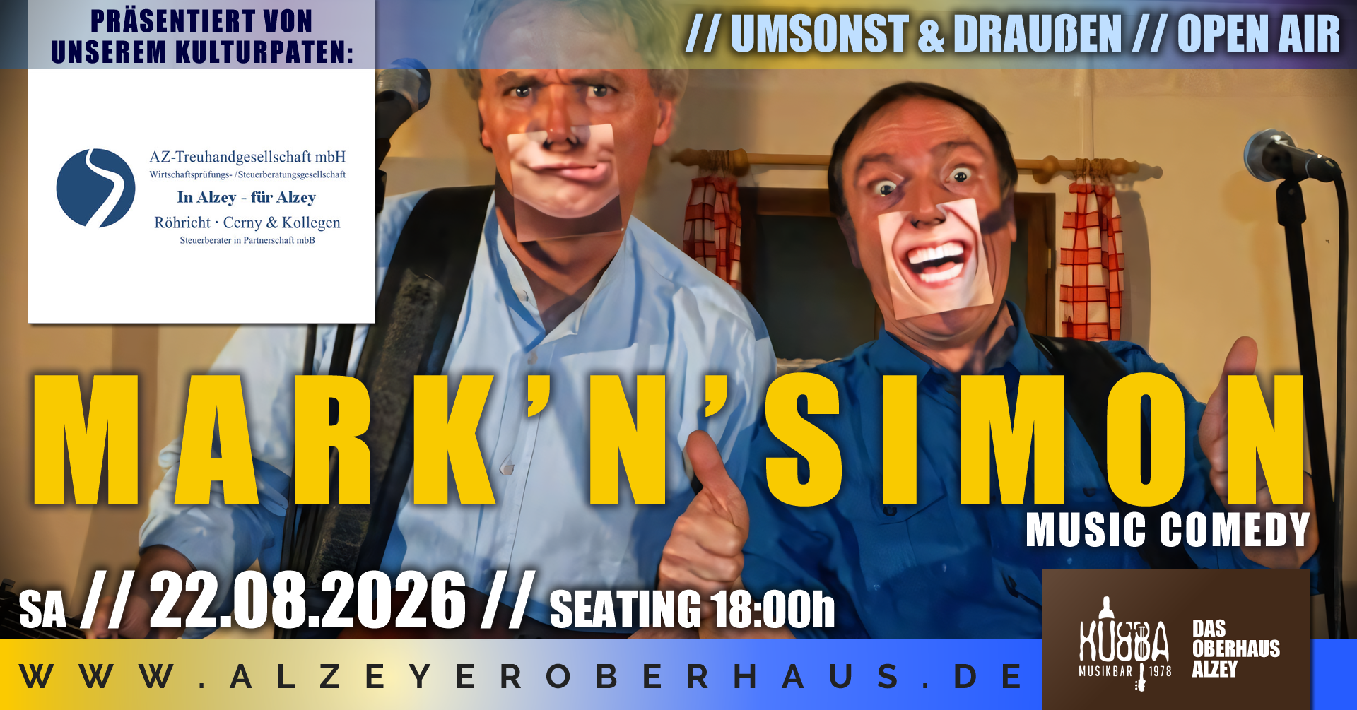 Es gibt viele “Comedians“, aber echte Komödianten wie Mark´n`Simon sind eher rar. Einmalig mit welcher Geschwindigkeit ein Gag den anderen jagt, professionell die Mischung aus Musik und Slapstick, aus Improvisation und Wortwitz. Ihre Sprache ist international – Dschinglisch: eine auch für des Englischen Unkundige leicht verständliche Kreuzung zwischen Deutsch und Englisch. “MusiComedy“, so nennen die Wahlmünchner ihre Mischung aus Musik und Comedy. Ihr Humor bleibt immer im Positiven, grenzt nicht aus und bezieht alles und jeden ein. Gerade deshalb sollte man sie besser im Auge behalten.So schafft die Dosis an sauber vorgetragener Musikparodie und Slapstick-Kabarett-Comedy genau die Mischung, die ein wahrhaftig unterhaltsames Programm ausmacht. Wohl deshalb zählen Entertainer wie Thomas Gottschalk und Alfred Biolek zu den bekennenden Fans von Mark´n`Simon.