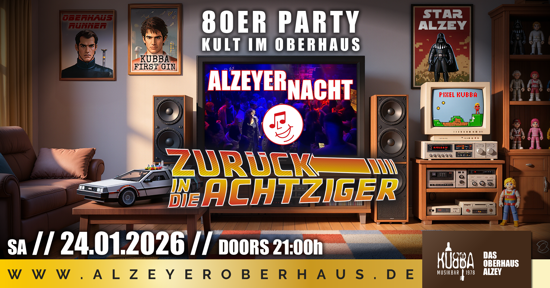 Hervorgehoben# Alzeyer Oberhaus Spiessgasse 4, Alzey, Rheinland-Pfalz, DeutschlandErsatztermin für die Alzeyer Nacht mit "Achtziger Party" im Oberhaus und Live-Musik von Backdrop im Kubba. Über unsere Website gekaufte Tickets für die Achtziger-Party sind gültig. Ebenso die Tickets für die Alzeyer Nacht, welche online oder an der Abendkasse erworben werden können. TICKETS GIBT ES IM KUBBA UND UNTER az-nacht.de Auf geht‘s "Zurück in die Achtziger“! Der Fluxkompensator ist funktionsbereit und der Zeitcomputer auf das richtige Datum eingestellt. Die nötigen 1.21 Gigawatt können wir Dank Doc Browns Fusionsreaktors jederzeit mit…