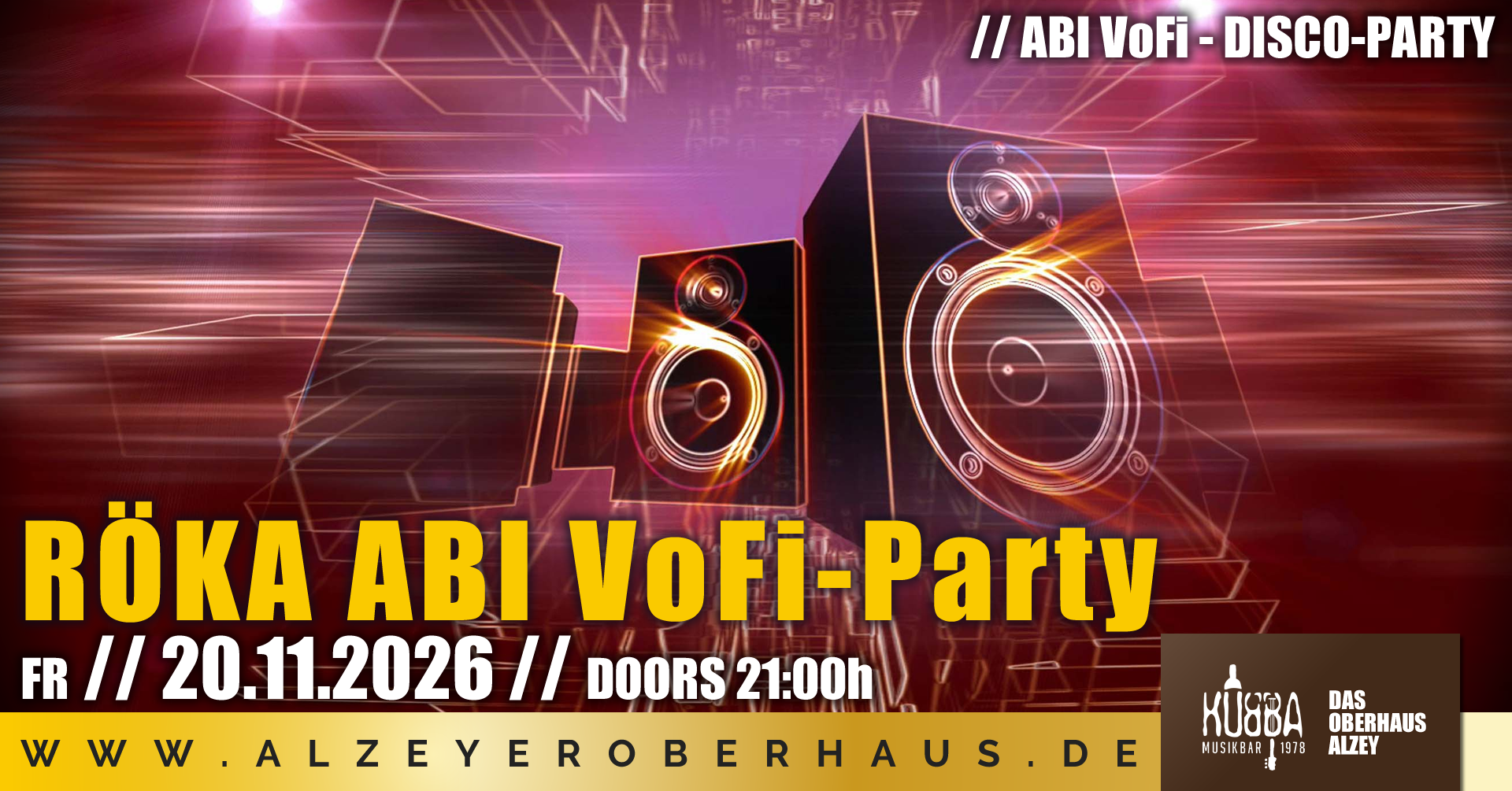 # Alzeyer Oberhaus Spiessgasse 4, Alzey, Rheinland-Pfalz, DeutschlandRÖKA Abi-VoFi-Party Tickets gibt's beim Abi-Jahrgang oder im Kubba ACHTUNG: Einlass ab 16 Jahren gegen Vorlage eines vollständig ausgefüllten Muttizettels und gegen Vorlage eines gültigen Ausweisdokuments. Muttizettel und Ausweis MÜSSEN physisch vorhanden sein muss! Kopien, Fotos, Videos usw. werden nicht akzeptiert! Offenkundige Urkundefälschungen können an die Behörden weitergegeben werden. Wir erlauben pro volljährige Aufsichtsperson jeweils nur eine minderjährige Begleitperson mit Muttizettel.