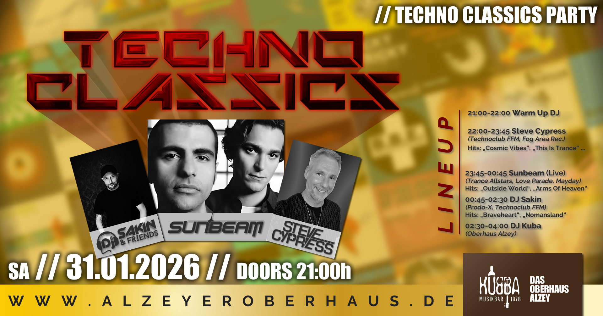 Hervorgehoben# Alzeyer Oberhaus Spiessgasse 4, Alzey, Rheinland-Pfalz, DeutschlandEs ist wieder Zeit für die besten Klassiker aus Dance, Trance und EDM. Line Up 🔸21:00-22:00h Warm Up DJ 🔸22:00-23:45h Steve Cypress (Technoclub FFM, Fog Area Rec.) 🎵Hits: „Cosmic Vibes“, „This Is Trance“ … 🔸23:45-00:45h Sunbeam (Live) (Trance Allstars, Love Parade, Mayday) 🎵Hits: „Outside World“, „Arms Of Heaven“ … 🔸00:45-02:30h DJ Sakin (Prodo-X, Technoclub FFM) 🎵Hits: „Braveheart“, „Nomansland“ … 🔸02:30-04:00h DJ Kuba